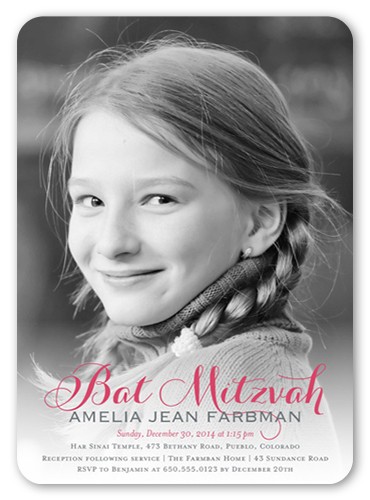 Mazel Tov! Celebrate your daughter's Bat Mitzvah with a personalized Bat Mitzvah invitation. Just add her photos and event details.