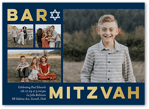 Mazel Tov! Celebrate your son's Bar Mitzvah with a personalized Bar Mitzvah invitation. Just add his photos and event details.