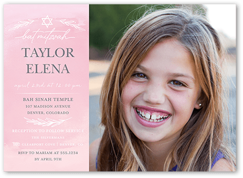 Mazel Tov! Celebrate your daughter's Bat Mitzvah with a personalized Bat Mitzvah invitation. Just add her photos and event details.