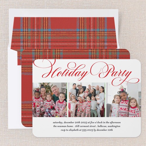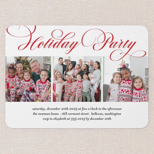 Invite loved ones to celebrate with this classic holiday card, perfect for your Christmas party. The design features elegant red script that reads “Christmas Party” or "Holiday Party,” depending on your preference, paired with a clean white background for a timeless look. Three photo slots let you share favorite moments, making this a multi photo Christmas card that feels personal and festive. The text is available in holiday red or you can click the color wheel icon to choose your own text color—great for coordinating with your party theme or photos. Sized at 5x7, this Christmas card is easy to personalize with event details and RSVP info. Send a holiday card that sets the tone for a joyful gathering.