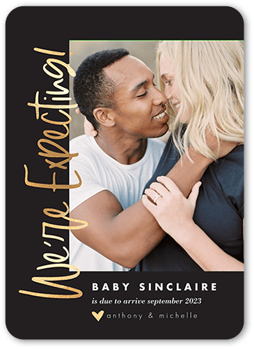 Share your exciting news with this cheerful pregnancy announcement. Let others know your little one is on the way with a happy baby belly, your favorite picture and an expected arrival date.