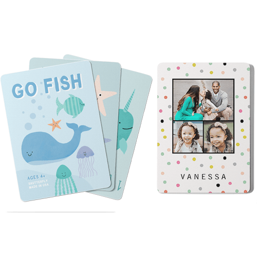 Make game time extra fun with personalized card games, available in the classic children's games Go Fish and Crazy 8s. The cards can be personalized with photos and text on one side and feature whimsical illustrations on the other. Both games provide a fun and educational way for children to learn their numbers, work on strategy, and decision-making skills. Great for home play or use in the classroom. Treat the special kids in your life to a one-of-a-kind gift.