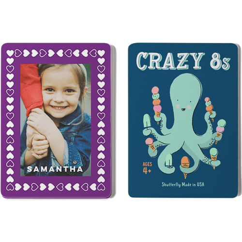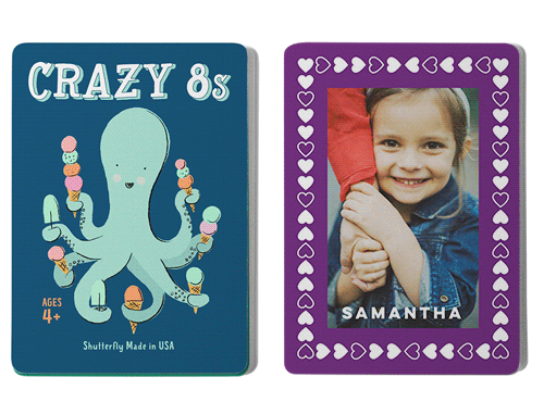 Make game time extra fun with personalized card games, available in the classic children's games Go Fish and Crazy 8s. The cards can be personalized with photos and text on one side and feature whimsical illustrations on the other. Both games provide a fun and educational way for children to learn their numbers, work on strategy, and decision-making skills. Great for home play or use in the classroom. Treat the special kids in your life to a one-of-a-kind gift.