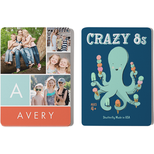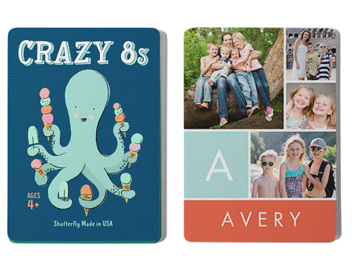 Make game time extra fun with personalized card games, available in the classic children's games Go Fish and Crazy 8s. The cards can be personalized with photos and text on one side and feature whimsical illustrations on the other. Both games provide a fun and educational way for children to learn their numbers, work on strategy, and decision-making skills. Great for home play or use in the classroom. Treat the special kids in your life to a one-of-a-kind gift.