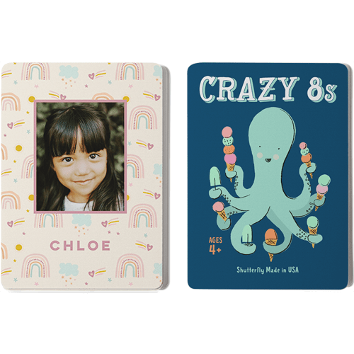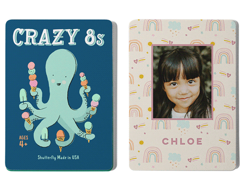 Make game time extra fun with personalized card games, available in the classic children's games Go Fish and Crazy 8s. The cards can be personalized with photos and text on one side and feature whimsical illustrations on the other. Both games provide a fun and educational way for children to learn their numbers, work on strategy, and decision-making skills. Great for home play or use in the classroom. Treat the special kids in your life to a one-of-a-kind gift.