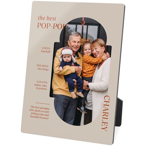 Showcase favorite photos and turn any space into a happy place with desktop plaques. Choose from different shapes, stylish backgrounds, and layouts for one or more photos for a unique look. Plaques include a built-in easel for horizontal or vertical display.