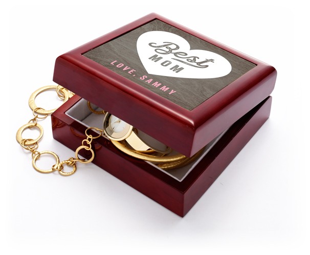 Relive a special memory every day. Inside this imported oak wood with a mahogany lacquer finish keepsake box, soft felt protects your jewelry and collectibles. On the lid, a vibrant photo tile celebrates all your special occasions.