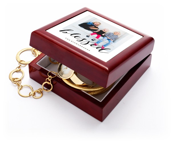 Relive a special memory every day. Inside this imported oak wood with a mahogany lacquer finish keepsake box, soft felt protects your jewelry and collectibles. On the lid, a vibrant photo tile celebrates all your special occasions.