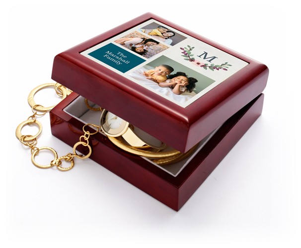 Relive a special memory every day. Inside this imported oak wood with a mahogany lacquer finish keepsake box, soft felt protects your jewelry and collectibles. On the lid, a vibrant photo tile celebrates all your special occasions.