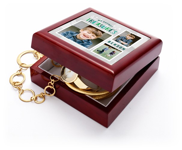 Relive a special memory every day. Inside this imported oak wood with a mahogany lacquer finish keepsake box, soft felt protects your jewelry and collectibles. On the lid, a vibrant photo tile celebrates all your special occasions.