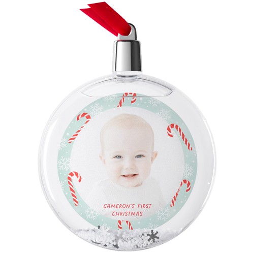• Clear plastic disk snow globe ornament