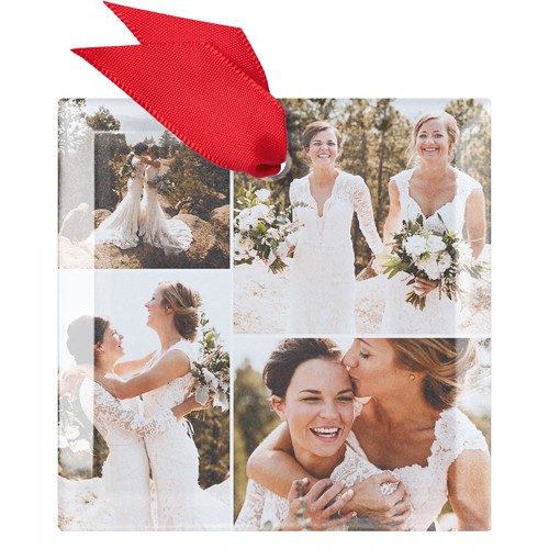 Celebrate your first holiday season as a married couple with this elegant glass photo ornament. The design features a classic square shape, beautifully showcasing four of your favorite wedding moments in crisp, vibrant color. Made from real, slightly frosted glass, this custom wedding Christmas ornament reflects twinkling lights on your tree, adding a touch of magic to your decor. Personalize it with your names or the year to create a truly unique Christmas ornament you’ll cherish for years to come. Available in three shapes—square, circle, and hexagon—these photo ornaments are a wonderful way to display your love story and add to your ornament collection. Each customized Christmas ornament comes in a soft storage pouch and hangs from the tree with a festive red ribbon, making it a thoughtful gift or keepsake for newlyweds.