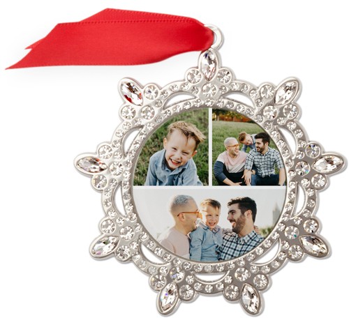 Bring a little sparkle to your holiday décor with this jeweled Christmas ornament. The traditional design features a silver-toned snowflake frame adorned with shimmering jewels, and a collage design for three family photos. This personalized Christmas ornament is a wonderful way to capture cherished memories from the year, whether it’s family portraits, special milestones, or joyful holiday moments. Each custom photo ornament comes in a soft storage pouch and hangs from the tree with a sleek red ribbon, ready to shine year after year. Jeweled ornaments make unique Christmas gifts, stocking stuffers, or keepsakes you’ll treasure for seasons to come.