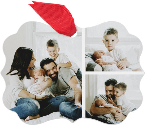 Celebrate the season this traditional metal Christmas ornament, featuring a collage-style layout that beautifully showcases three favorite photos. The crisp, vibrant images are printed on both sides, so you can add even more memories to the back. Crafted from durable, high-quality coated aluminum, this personalized Christmas ornament is designed to last for years to come. Customize it with your family name, the year, or a heartfelt message to make it truly unique. Available in four shapes—square, circle, rectangle bracket, and gift tag—this custom photo ornament comes in a soft storage pouch and hangs from the tree with a festive red ribbon. Photo ornaments are a wonderful way to add to your ornament collection, capturing the special little moments that made your year. They also make thoughtful gifts or reusable present gift tags for loved ones.