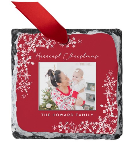 This elegant, personalized slate ornament will be a one-of-a-kind addition to any tree. Made of natural stone, no two ornaments will be exactly alike. Available in round or square, the ornaments are personalized on one side and come with a red ribbon. Customize with a photo, monogram and more for the perfect gift for family, friends, teachers and colleagues.