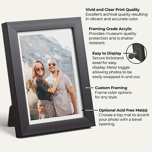 Keep special pics of sweet memories close at hand with beautifully framed tabletop prints. Our archival-quality inks ensure vivid, lasting colors for your photos, so you can enjoy them for a lifetime. Plus, your photos are covered by a protective acrylic sheet, so you can look back on those important milestones and unforgettable occasions for years to come.