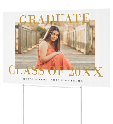 Celebrate what you love with this personalized corrugated yard sign, which is great for honoring your grad, announcements, weddings, parties and more. Double-sided printing makes your sign easy to spot from either direction. Set up quickly and easily with an aluminum H" step stake that's easy to insert into the ground and securely holds the sign in place."